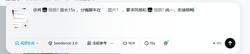 这里我们要用到即梦的 Seedance2.0 的视频延长功能。将第一次生成的视频作为参考,继续往后延长。