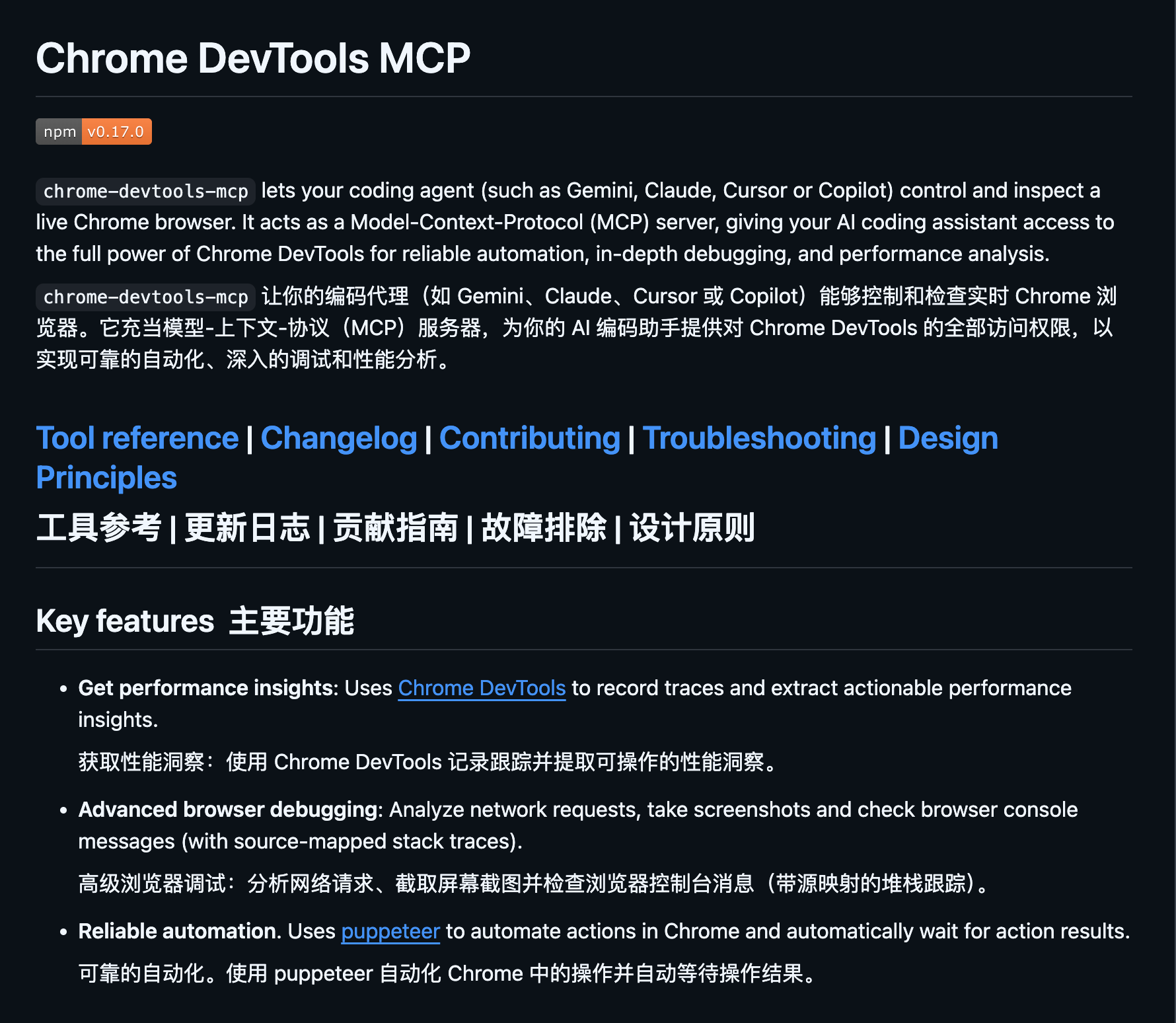 ChromeDevTools/chrome-devtools-mcp 是一个 Model Context Protocol(MCP)服务器,把“真实运行中的 Chrome + DevTools 能力”开放给各类 AI 编程助手(如 Claude、Cursor、Copilot、Gemini 等),让代理不再“盲写代码”。它可通过 DevTools/Chrome DevTools Protocol 获取并分析 性能 Trace、网络请求、控制台日志(含 source map 堆栈)、截图等信息,并结合 Puppeteer 做更可靠的页面自动化与结果等待,从而实现自动验证改动、定位前端问题、做性能诊断与优化建议。支持用 npx 快速接入到 MCP 客户端,并提供关闭用量统计与 CrUX 相关查询的参数选项。