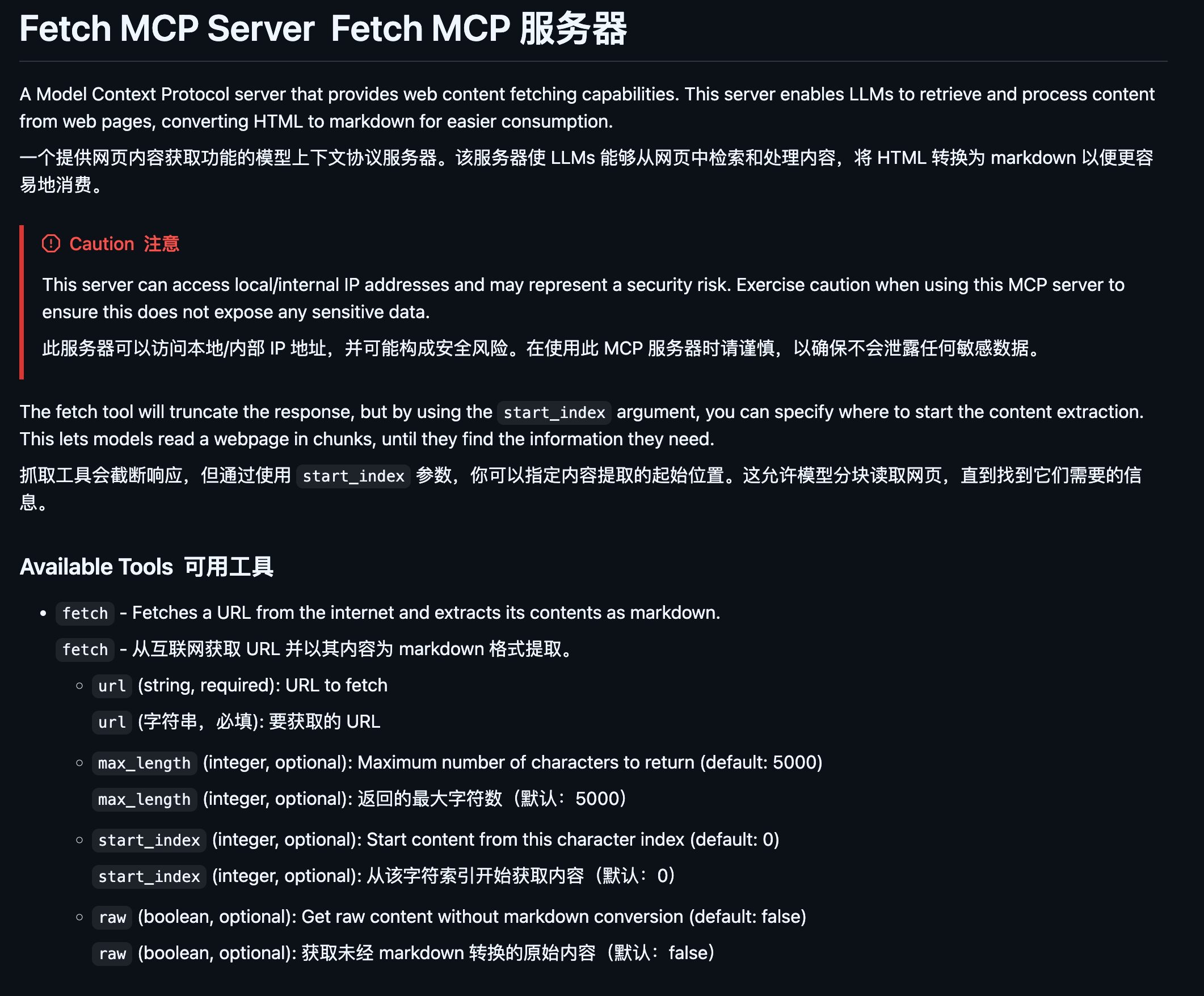 Fetch 是 modelcontextprotocol/servers 提供的参考级 MCP Server,面向大模型/智能体的“网页取数器”。它提供 fetch 工具:按 URL 抓取网页内容,并可将 HTML 自动清洗转换为更适合模型阅读的 Markdown;支持用 max_length 控制返回长度、用 start_index 分段续读,便于长文按块检索;默认遵守 robots.txt(模型工具调用时)、可自定义 User-Agent 与代理配置。由于可访问本地/内网 IP,需注意权限与数据泄露风险。