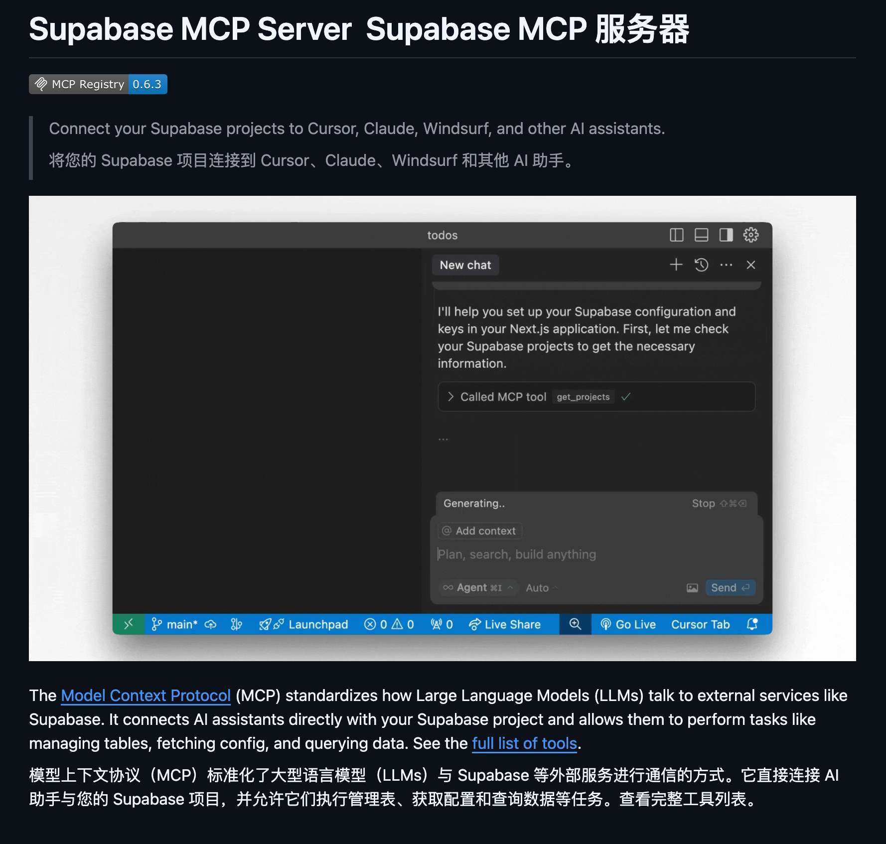 supabase-mcp 是一个基于 Model Context Protocol(MCP)的 Supabase 连接器/服务器,让 Cursor、Claude、Windsurf 等 AI 助手能在授权后直接“操作你的 Supabase 项目”:例如查询数据、管理表结构、读取配置与文档,并按需启用数据库、调试、函数、存储、分支等工具组。它支持通过 URL 参数开启 read_only 只读模式、用 project_ref 将权限限定到单一项目,并可用 features 精细控制可用能力,便于在安全边界内把 AI 接入真实后端工作流。