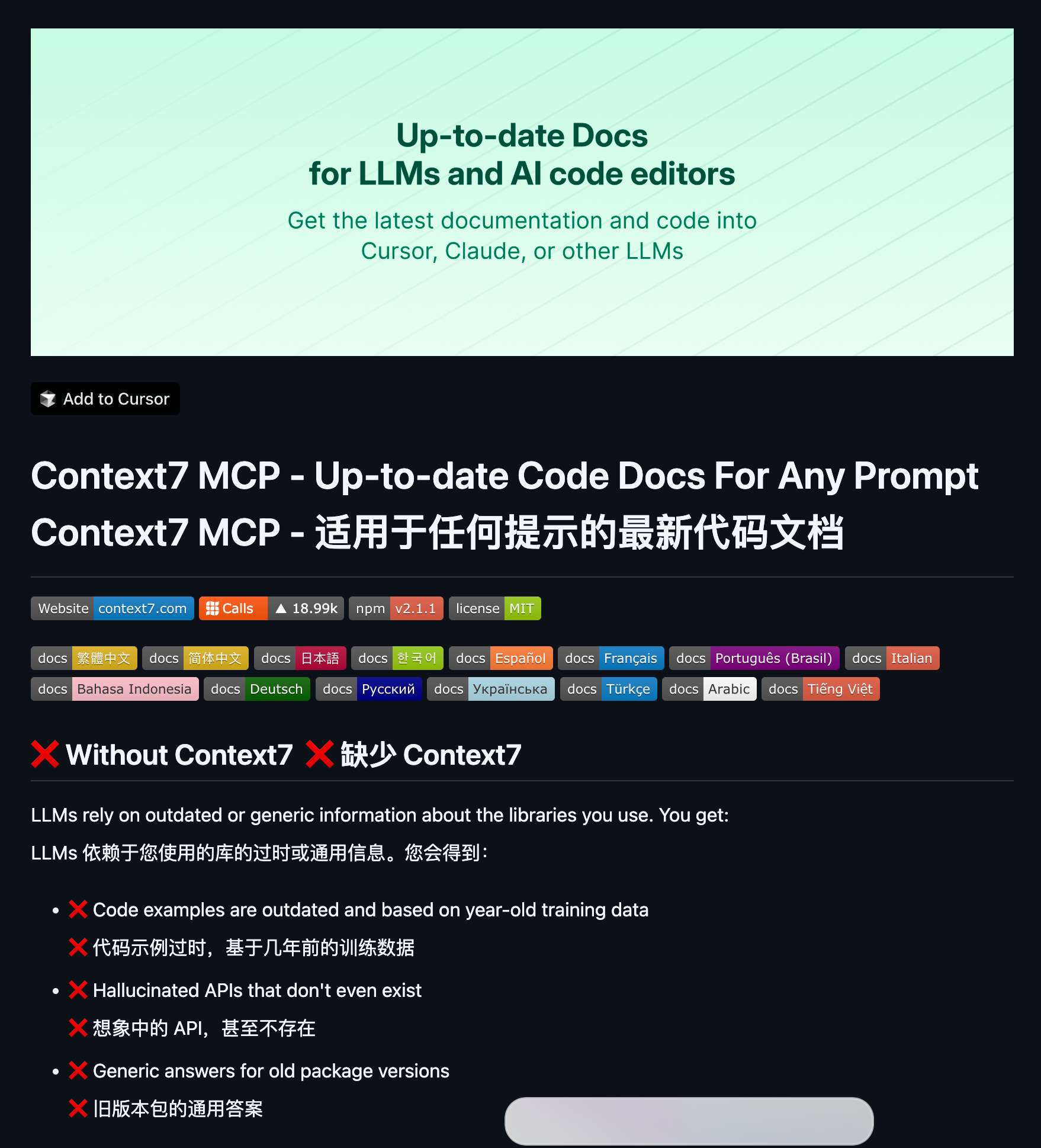 Context7 是 Upstash 推出的 MCP 文档增强服务:让 Cursor、Claude Code 等 AI 编程工具在生成代码时,自动拉取最新、版本匹配的官方文档与示例代码,并直接注入到提示词上下文中,从而减少“过时示例 / 幻觉 API / 版本不一致”的问题。使用方式很轻:在提问里加一句 use context7,或在客户端规则中设为自动触发;也可先用 resolve-library-id 定位库,再用 query-docs 精准查询指定库(甚至指定版本)的相关片段。支持远程 HTTP(API Key / OAuth2)或本地 npx 部署,适合团队统一接入与个人提升代码生成可靠性。