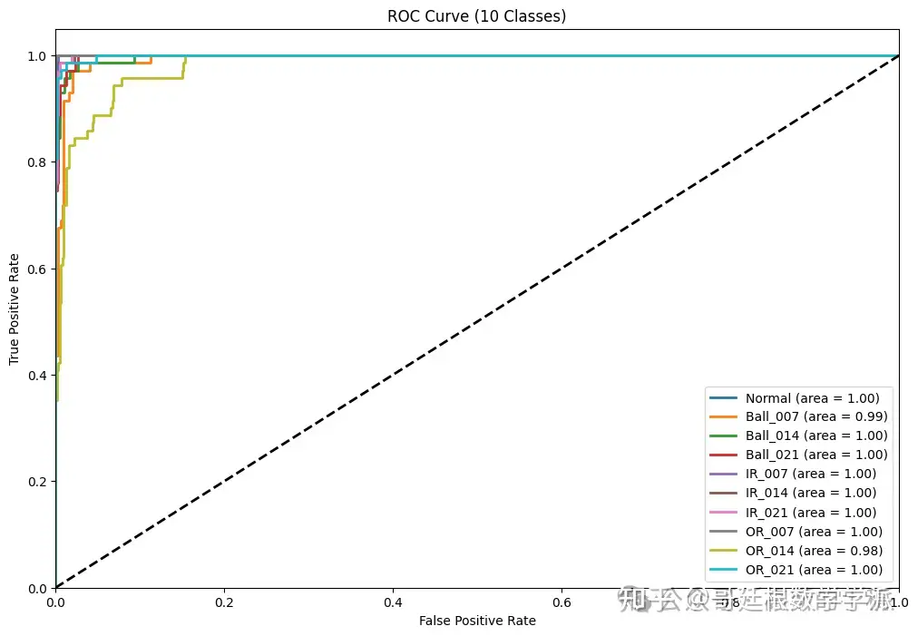 数据加载与类别映射遍历指定目录下的所有.mat文件,根据文件名中的关键词(如'Normal'、'B007'、'IR014'、'OR021'等)将样本分为10类:正常、三种尺寸的滚动体故障、三种尺寸的内圈故障、三种尺寸的外圈故障。提取每个文件中的驱动端振动信号(DE_time)并存储。