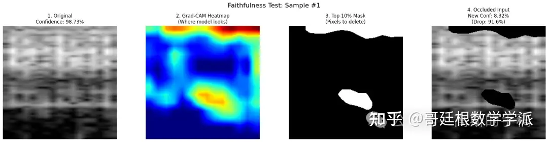 Faithfulness指标计算:随机选取50个高置信度样本,删除热力图中最关键的20%像素(置零),重新预测并计算置信度下降百分比,量化解释的忠实度。
