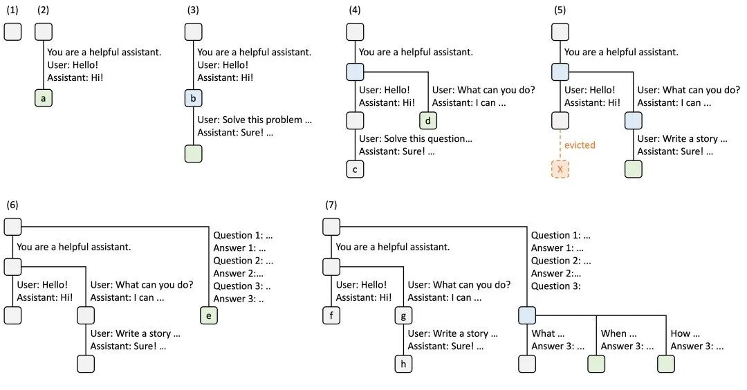 RadixAttention:通过基数树(Radix Tree)对KV缓存的公共前缀进行高效复用,结合LRU驱逐策略与引用计数机制,显著提升缓存利用率。不同于传统框架在推理结束后即丢弃缓存,SGLang持久化保留提示与生成内容的KV状态于基数树结构中,从而支持快速的前缀匹配、缓存复用、动态插入与智能驱逐。该设计极大增强了系统在多轮交互与序列规划场景下的性能,实测表明,在Llama-7B模型上执行多轮对话任务时,其吞吐量较vLLM提升达5倍。