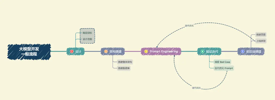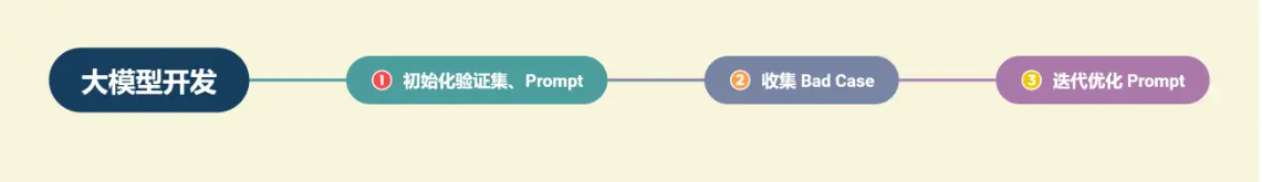 - 大模型开发:更敏捷、灵活,不会在初期显式地确定训练集、验证集,而是直接从实际业务需求出发构造小批量验证集,设计合理 Prompt 来满足验证集效果。然后,不断从业务逻辑中收集当下 Prompt 的 Bad Case,并将 Bad Case 加入到验证集中,针对性优化 Prompt,最后实现较好的泛化效果。