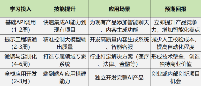 业务赋能 突破瓶颈:传统开发者(Java/前端等)学习Transformer架构与LangChain框架,向AI全栈工程师转型。