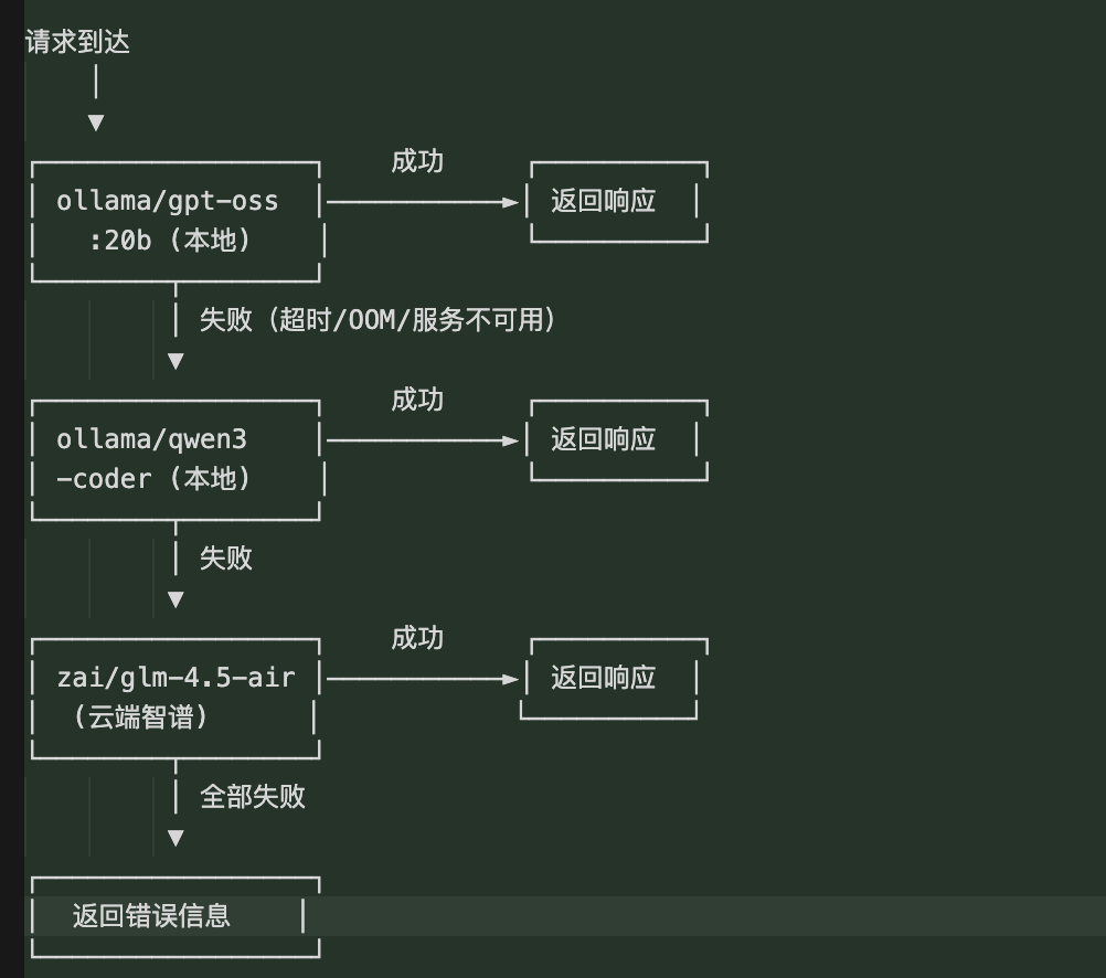 gpt-oss:20b (本地) → qwen3-coder (本地) → glm-4.5-air (云端智谱)