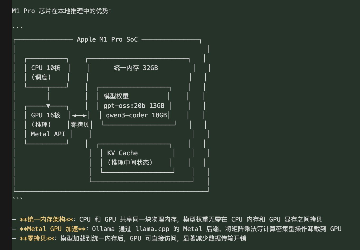 **摘要**:本文详细记录了在 MacBook Pro(M1 Pro / 32GB)上,通过 Ollama 部署本地大模型并接入 OpenClaw AI 平台的全过程。涵盖环境准备、Ollama 安装与模型拉取、OpenClaw 配置修改、模型性能基准测试,以及本地模型与 OpenClaw 的通信架构原理。