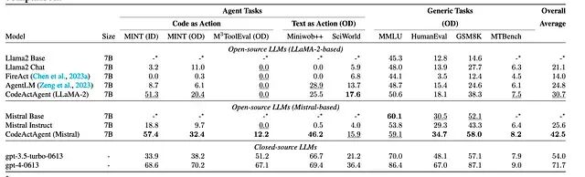 比如 CodeActAgent(Mistral-7B),在同等规模的开源模型里排在前列,通用 Agent 任务得分明显提高,同时在 MMLU、GSM8K、HumanEval 等通用能力评测上也没有退化。