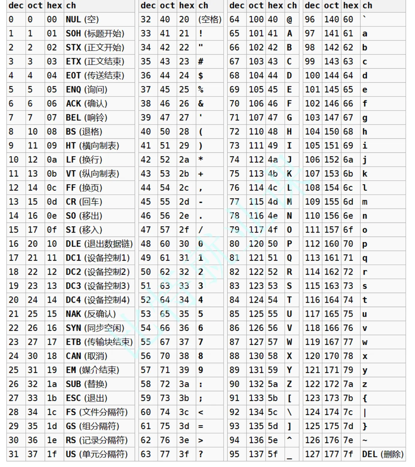 如上,只需记忆几组特殊的数据:大小写字母,数字字符0—9,换行符\n的ASCII值是10,值得注意的是大小写字母字符的ASCII码值的差为32。