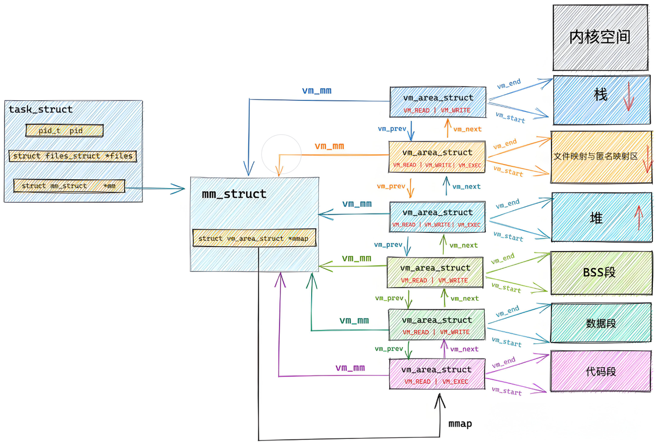 进程创建时,内核会为其分配mm_struct(内存描述符)和多个vm_area_struct(虚拟内存区域描述符),这些结构的初始化数据全部来自 ELF 文件的程序头表(Program Header Table)。