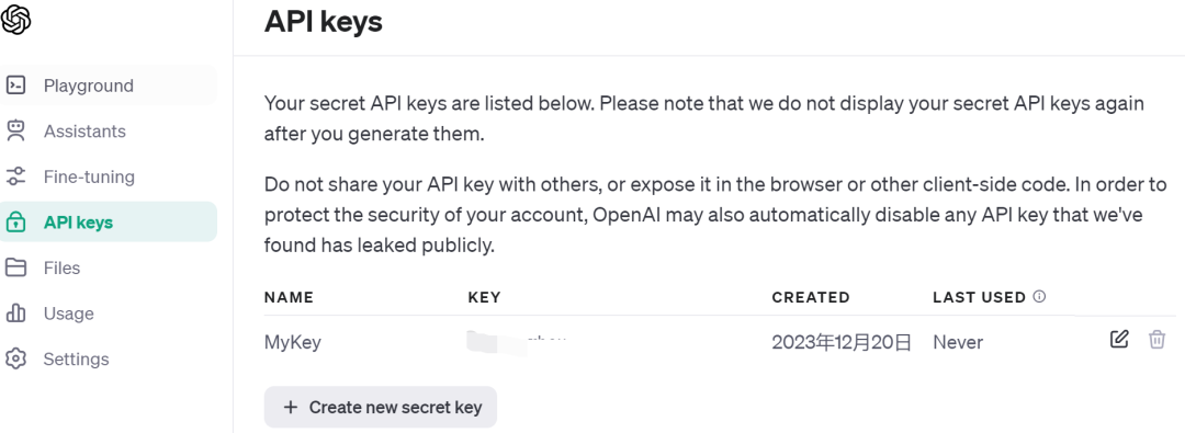 2、申请OpenAI的账户,要获取 OpenAI API 密钥,如下图所示:
