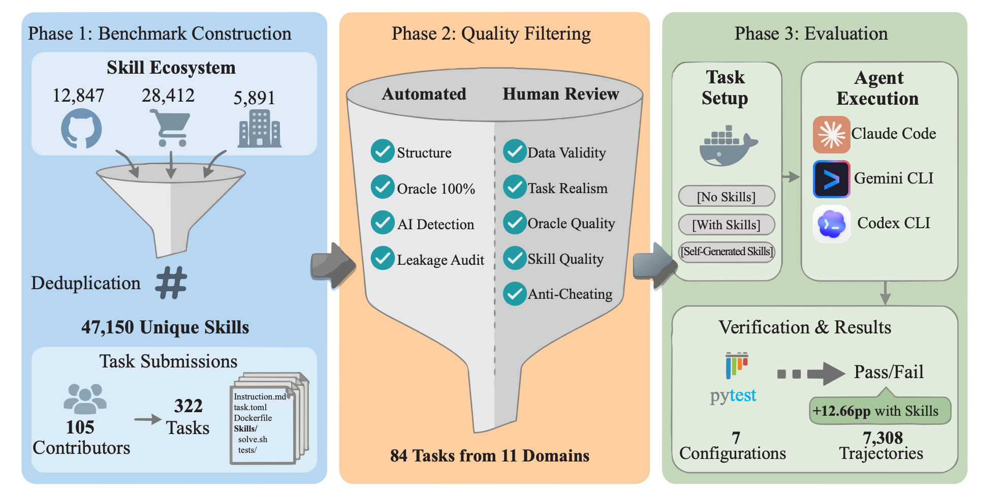 总计汇聚后,通过去重得到 47,150 unique skills,有 322 位贡献者提交 105 个候选任务