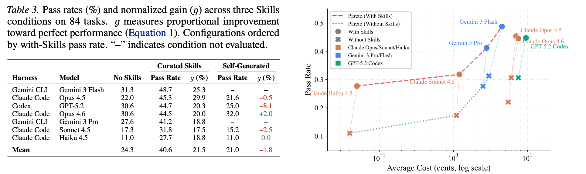 Self-generated Skills:平均通过率:21.0%,对应 g 的均值是 -1.8
