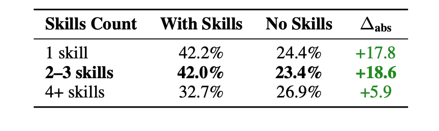 技能数量 2–3 个模块最好,太多反而拖累,按任务提供的 skill 数量分组 2–3 skills 的提升最大(+18.6pp),4 个以上提升很小,甚至可能带来认知负担/冲突