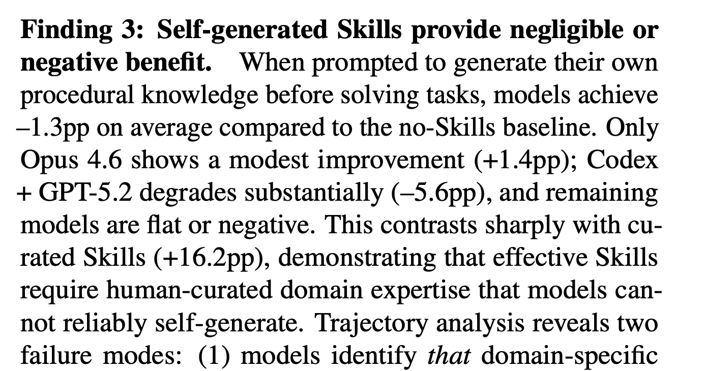 特别是 Curated Skills 包含有领域特定知识,比如在 failure analysis 里作者就说过 Self-generated 常见问题是: