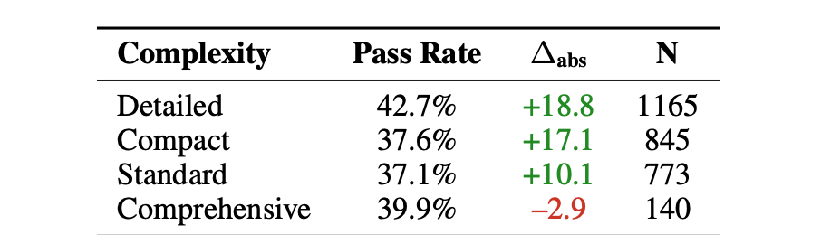 技能“文档复杂度”上,聚焦型胜过“大全型”,论文把把 Skills 文档分成 detailed/compact/standard/comprehensive,结果是: