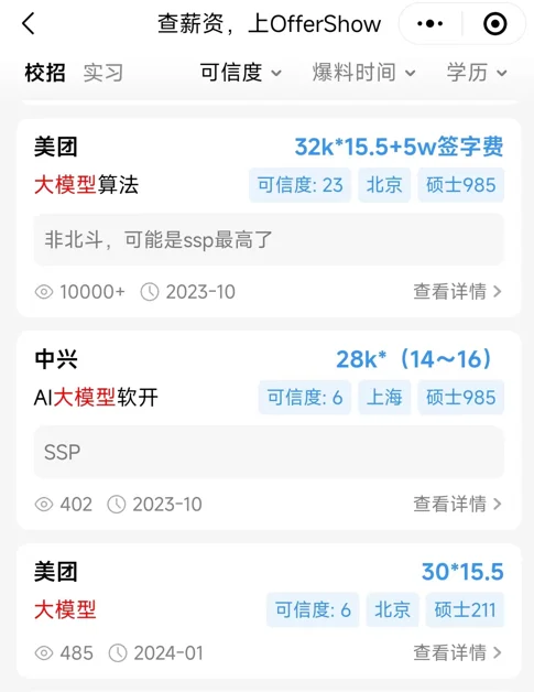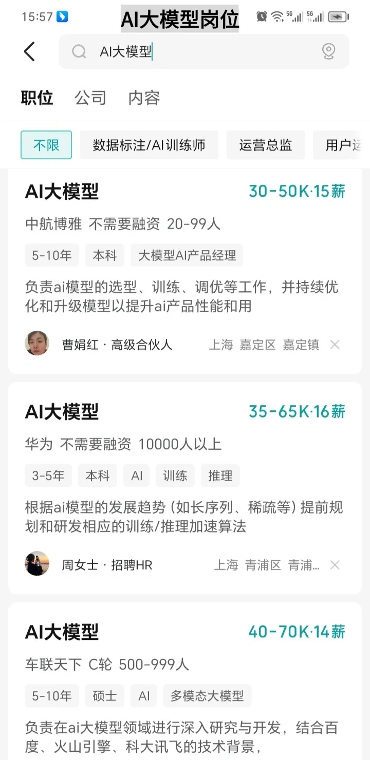 人工智能大模型相关岗位薪酬也是一路上涨,打开Boss直聘,可以明显看到人工智能大模型相关岗位的薪酬还是非常诱人的。