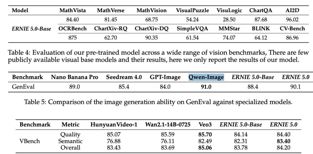 ERNIE 5.0在视觉理解(如文档问答)和生成(如GenEval图像生成)任务中均具竞争力。表5显示,其图像生成质量与专业模型相当。