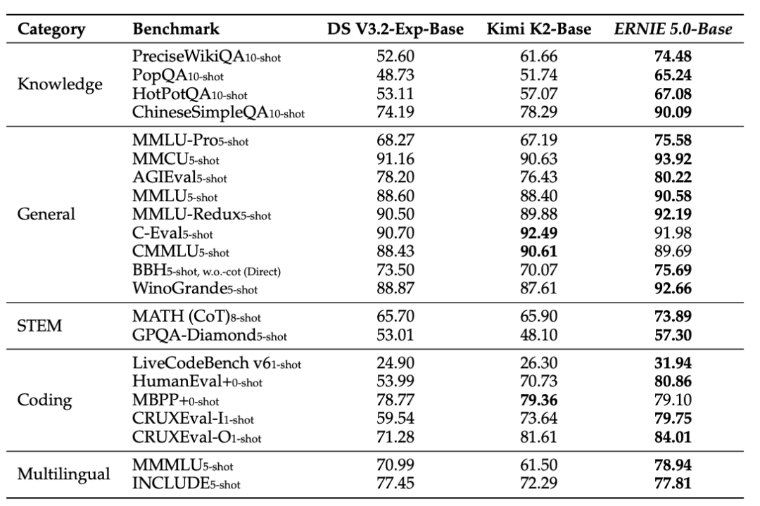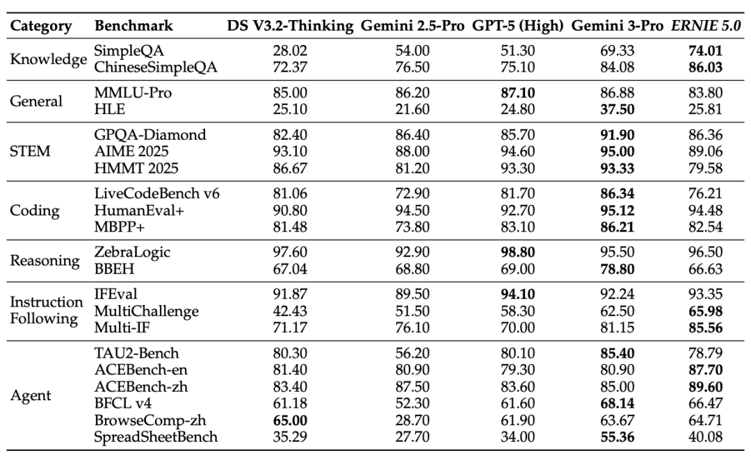 表1:语言基准测试对比。ERNIE 5.0在知识密集型任务中优势显著,表明统一预训练有效整合了多语言事实知识。