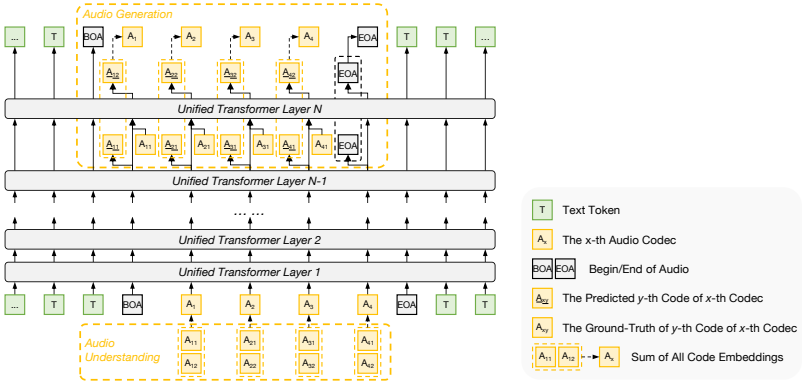 音频信号通过残差向量量化(RVQ)转换为分层令牌,第一令牌编码高层语义,后续令牌保留细节。深度自回归架构支持跨编解码维度的结构化预测。