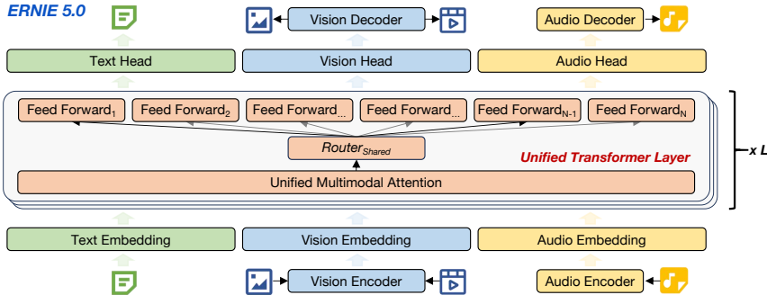 ERNIE 5.0的核心架构基于超稀疏MoE设计,所有模态共享统一的“下一组令牌预测”目标。文本、图像、视频和音频被映射到共享令牌空间,并通过序列化处理。