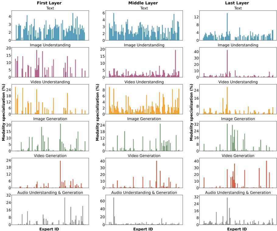 跨模态知识共享:模态无关的路由机制使专家自发专业化,促进深层跨模态交互。