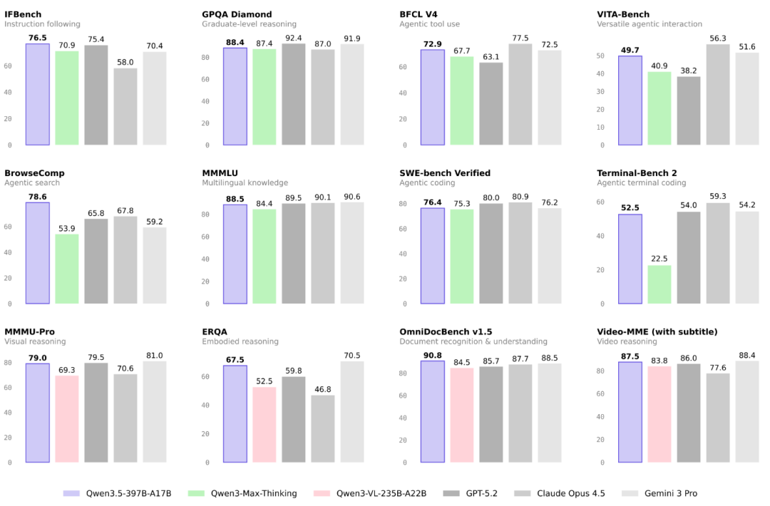 这一点在数学推理任务中表现得特别明显:面对一张数学图表,Qwen3.5能直接提取图像中的数据和逻辑关系,结合文字指令解题,而不是先把图表转成文字描述再推理,效率和准确率都大幅提升——在MathVision任务中,它拿到了88.6的高分,超过了GPT5.2和Gemini-3 Pro。