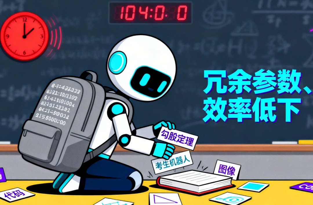 现在的大模型,就是这个“背满书包的考生”。为了覆盖所有任务场景,它们把海量参数都“激活待命”,但单次推理时,绝大多数参数都是冗余的——处理简单的文本生成,却要调动处理复杂数学推理的参数;理解图片内容,却要激活处理代码的模块。