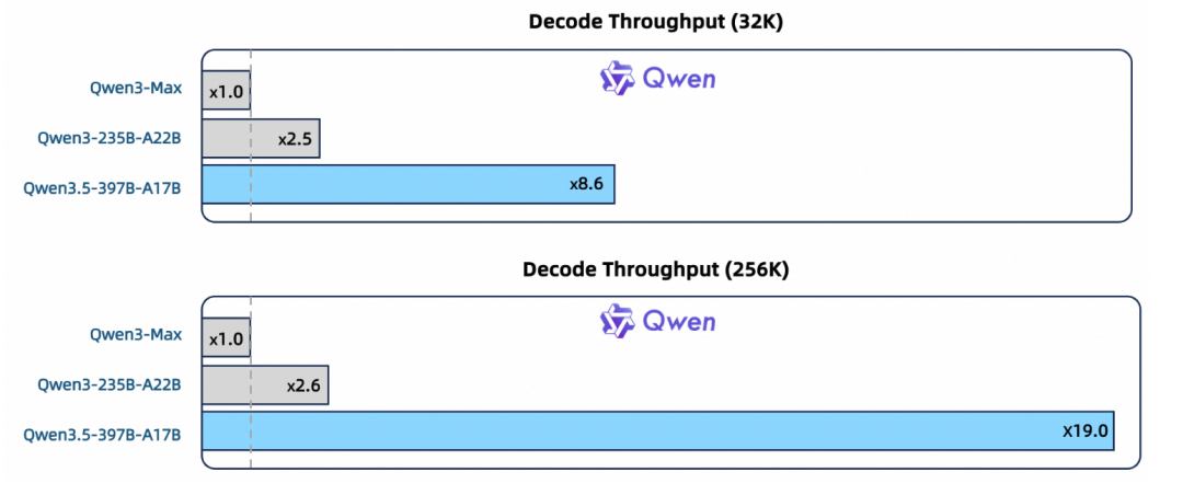 这些优化带来的效果非常直观:在32k上下文长度下,Qwen3.5的解码吞吐量是Qwen3-Max的8.6倍;在256k超长上下文下,更是达到了19倍——意味着处理两小时的视频或百万字的文档,以前要等几十秒,现在几秒就能完成。