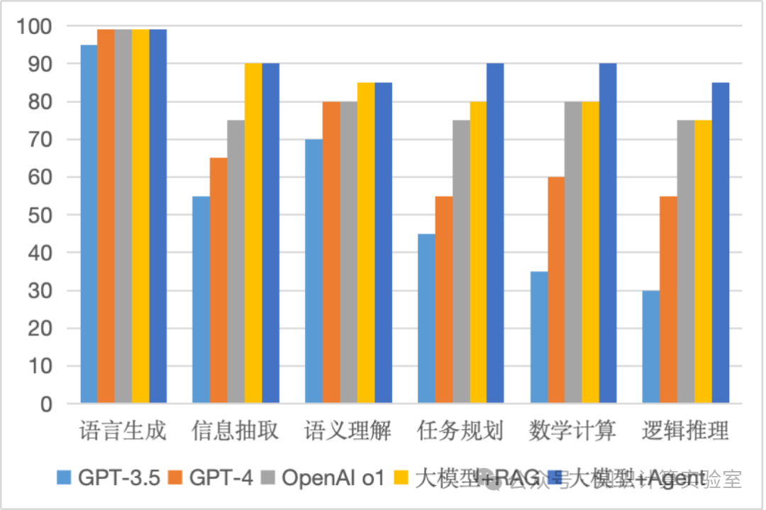 图5比较了OpenAI自ChatGPT发布以来的GPT-3.5、GPT-4与OpenAI o1三个里程碑大模型的能力,主要考察基础语言能力、信息抽取、语义理解以及推理能力。左边的并不是代表能解决问题的百分比,而是代表大致的解决问题的能力。100代表能找出最优解完美解决;90大致代表与人类顶尖水准相当;70大致代表与人类平均水准相当;30大致代表展现出一定的能力。从图5中可以看出,一方面,可以看到这些大模型能力飞速发展,尤其是在复杂的推理能力上。但是,另一方面,也可以看到,它们在这些复杂能力上仍然有不少欠缺。而这,对很多行业领域的核心应用而言,还存在很大的距离。