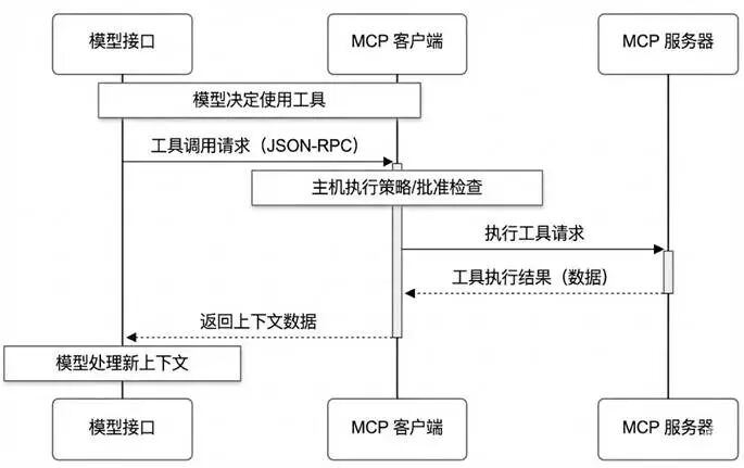 图2展示从模型接口发起工具调用请求,经过主机权限检查,再到MCP 服务器执行并返回结果的完整闭环。