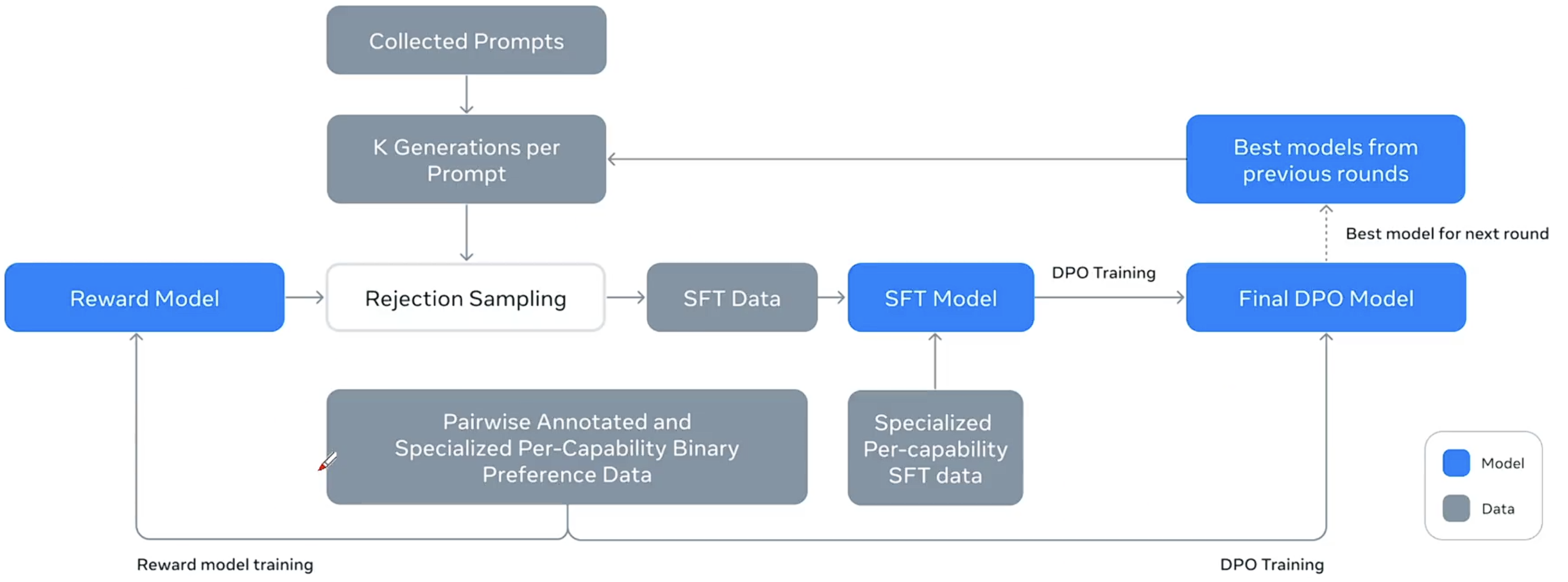lllama 3.1循环6次(post-train):best model 基于几十万条colleted prompts =>生成百万条(每条生成大概20个)回答(合成数据)=>rejection sampling 择优转成SFT数据(Q&A)