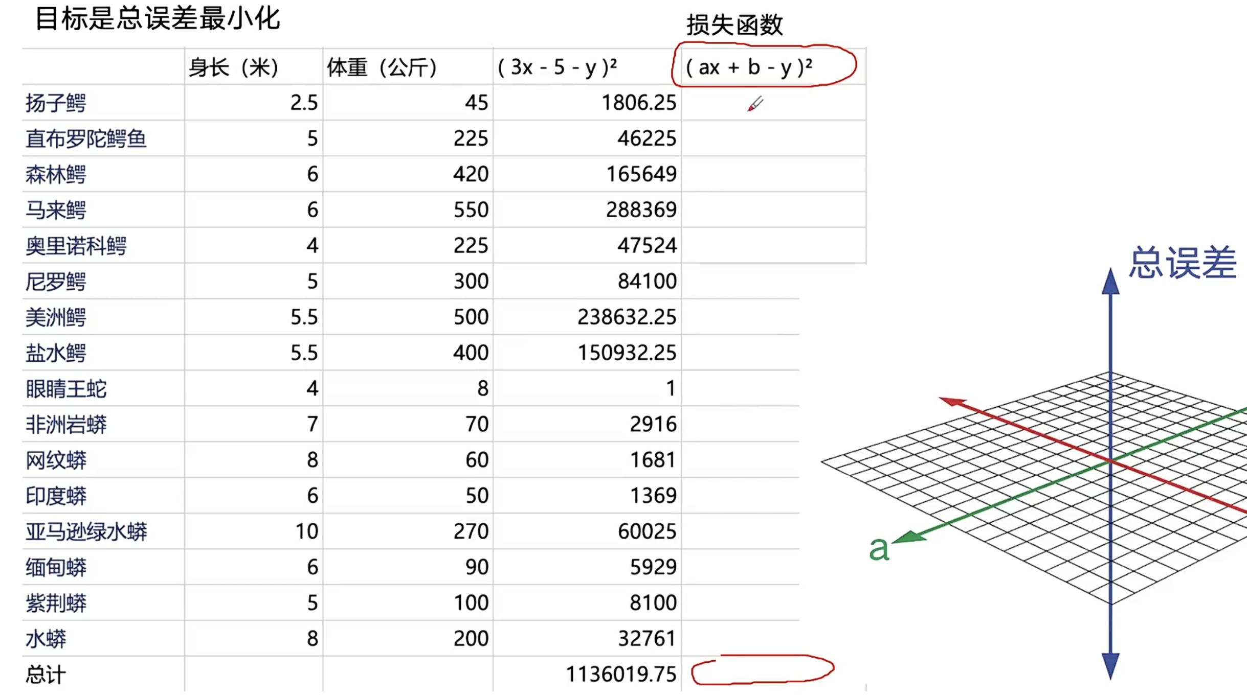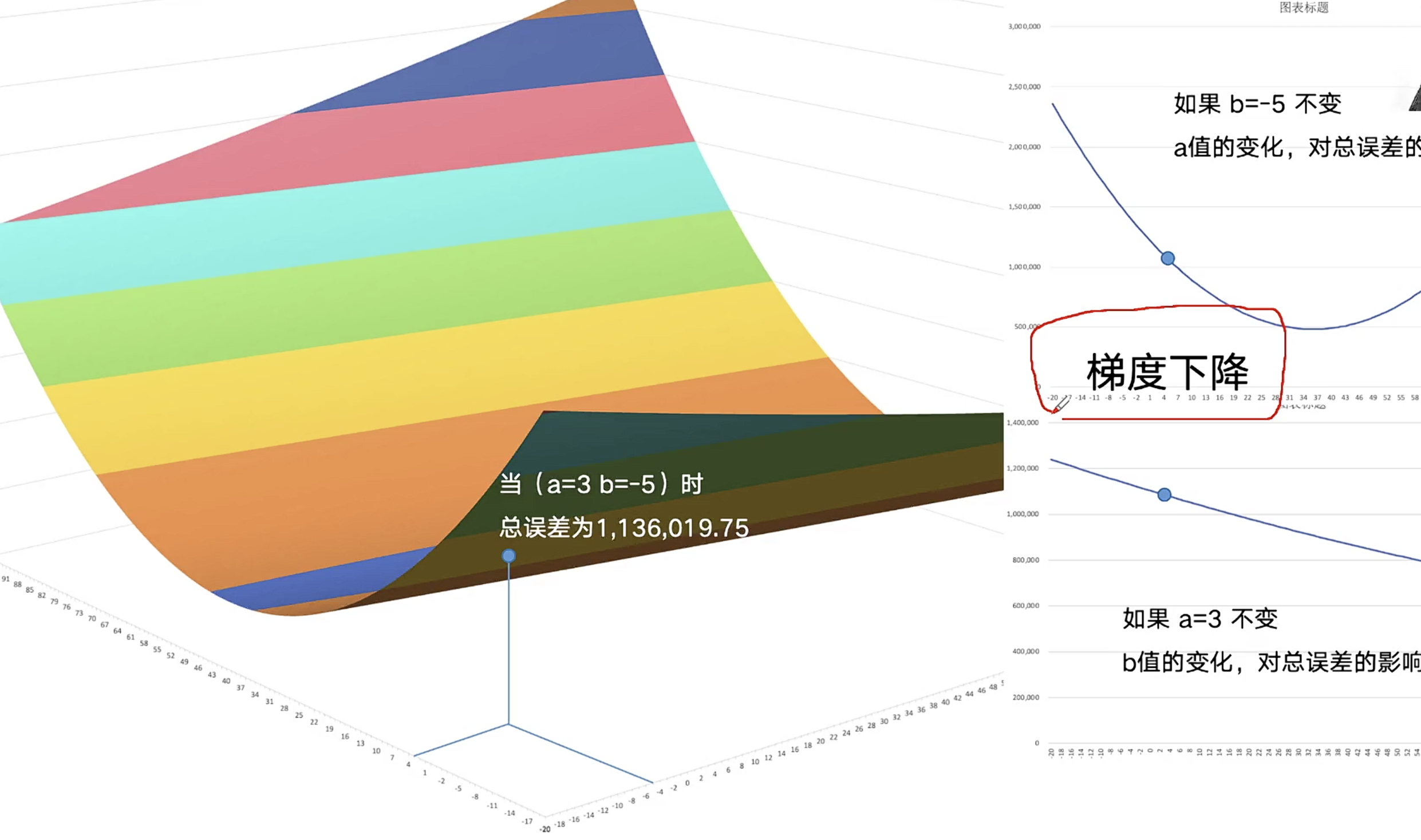 穷尽可能是参数,目标就是要想办法得到一组a和b的值 使总误差最小化。