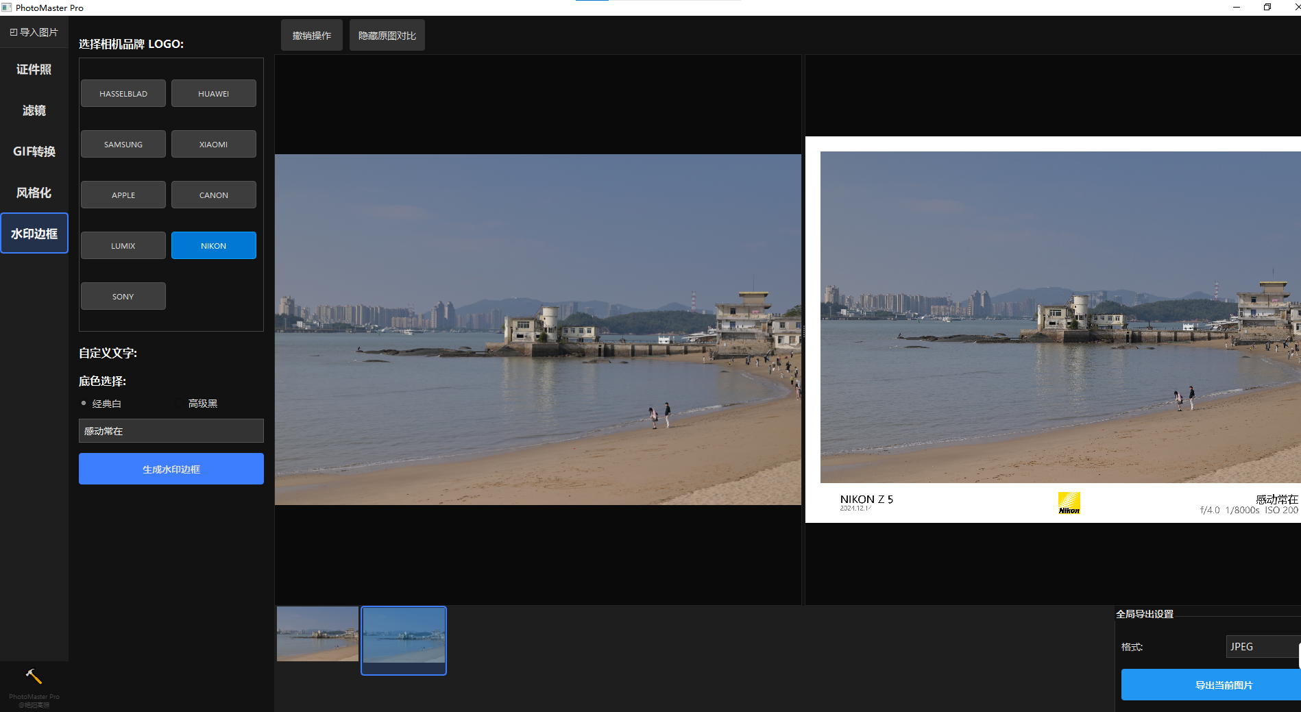 品牌 Logo 合成:内置索尼、佳能、尼康等各大主流相机品牌矢量 Logo,自动合成具有艺术感的白色/黑色画框水印。