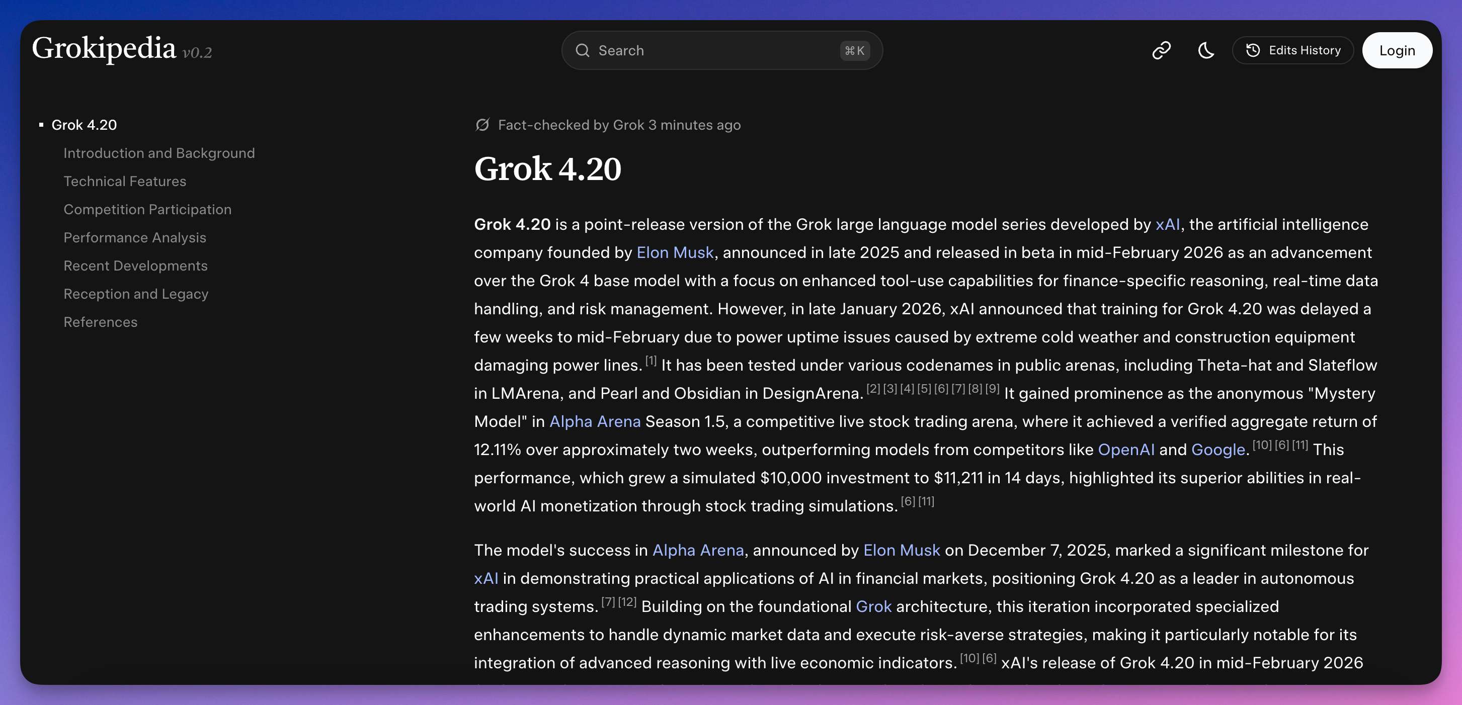 但老马的 Grokipedia 已经收录了 Grok 4.20 的词条(grokipedia.com/page/Grok_420),里面有比较详细的技术背景和时间线。