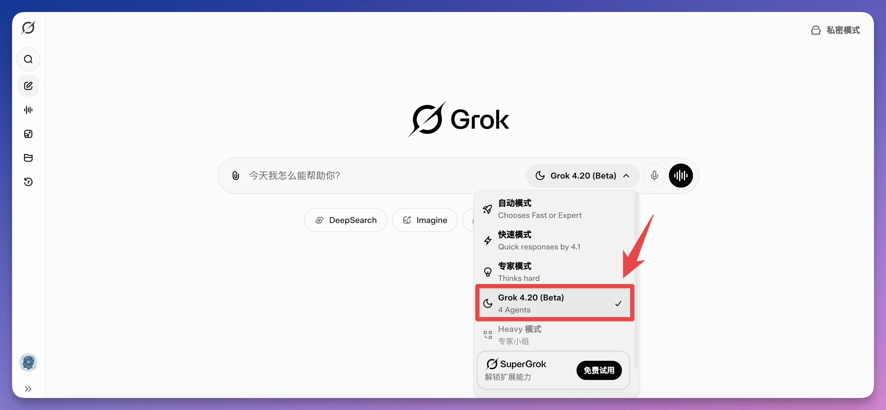 打开 grok.com 或 Grok 手机 App,在模型选择器里找到 Grok 4.20 (Beta)。