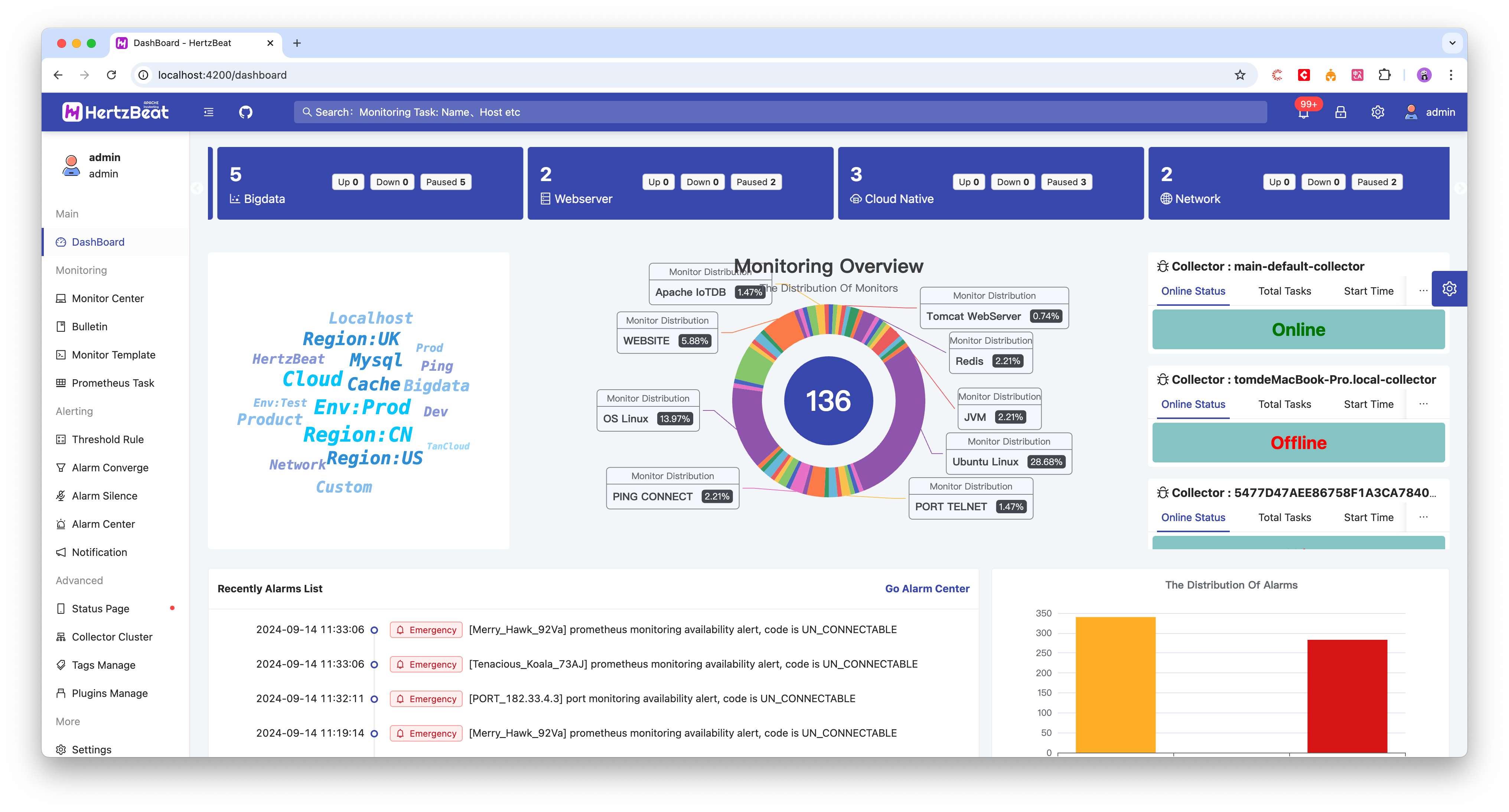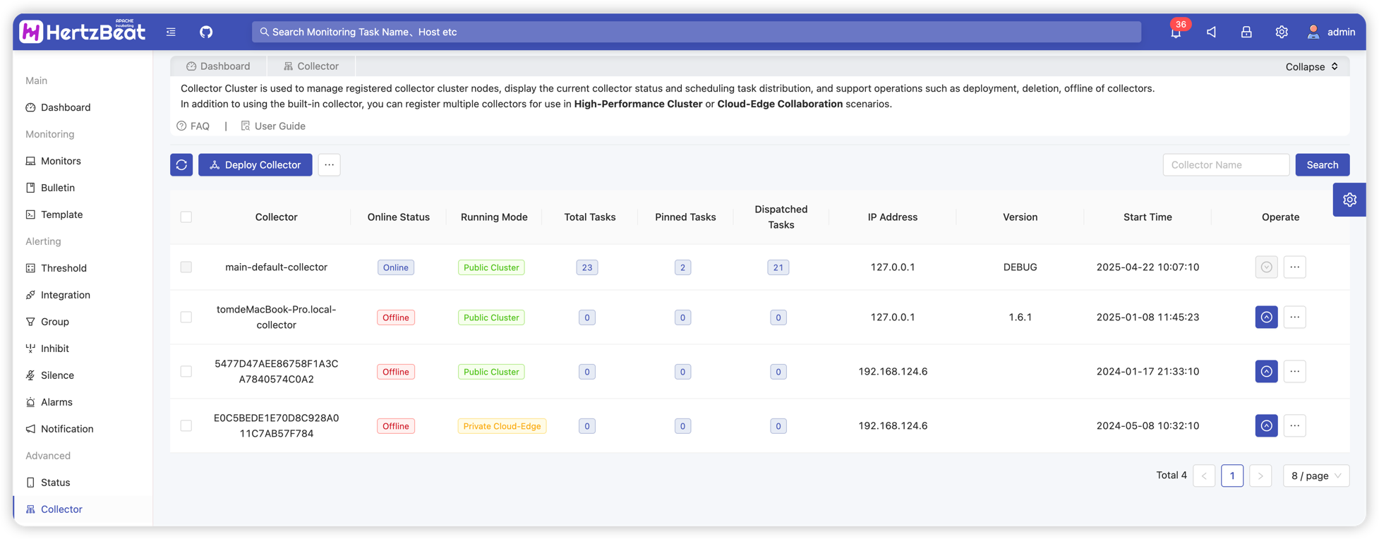 展示当前注册的采集器集群状态,包括采集器的上线状态,监控任务,启动时间,IP地址,名称等