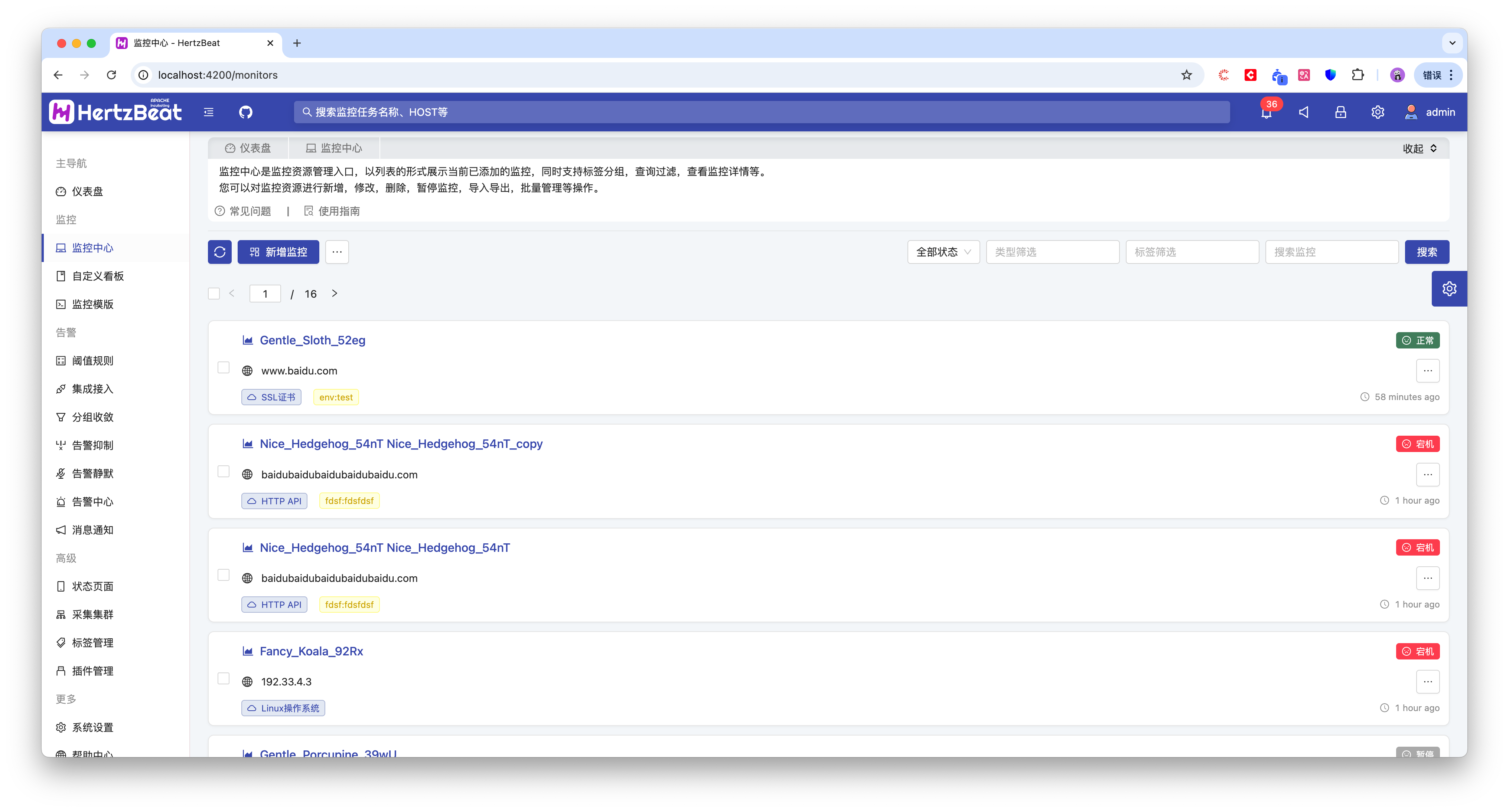 以列表的形式展示当前已添加的监控,支持对监控的新增,修改,删除,取消监控,导入导出,批量管理等