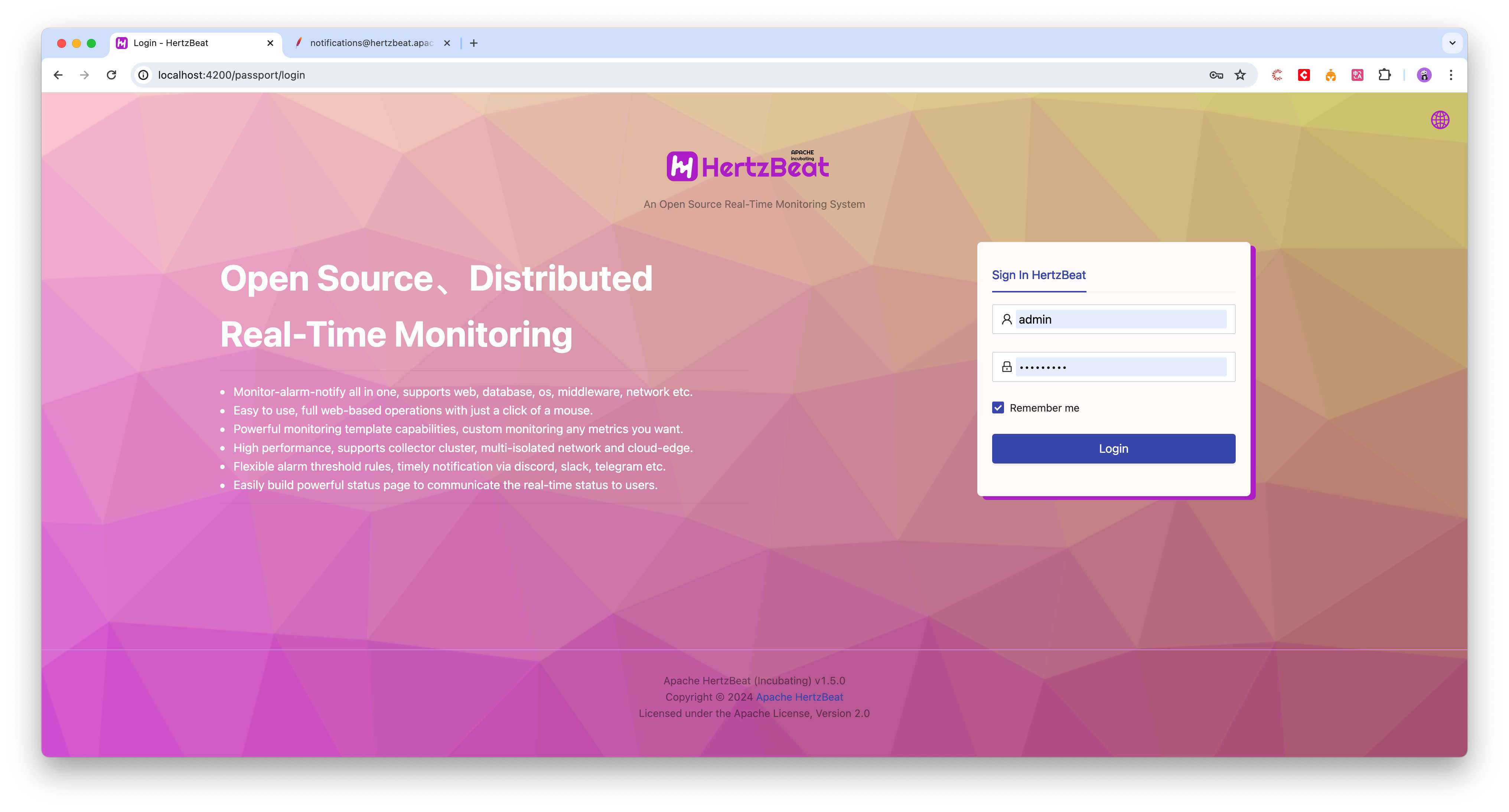 用户管理: 系统的用户管理统一由配置文件 sureness.yml 维护,用户可以通过修改此文件来新增删除修改用户信息,用户角色权限等。默认账户密码 admin/hertzbeat