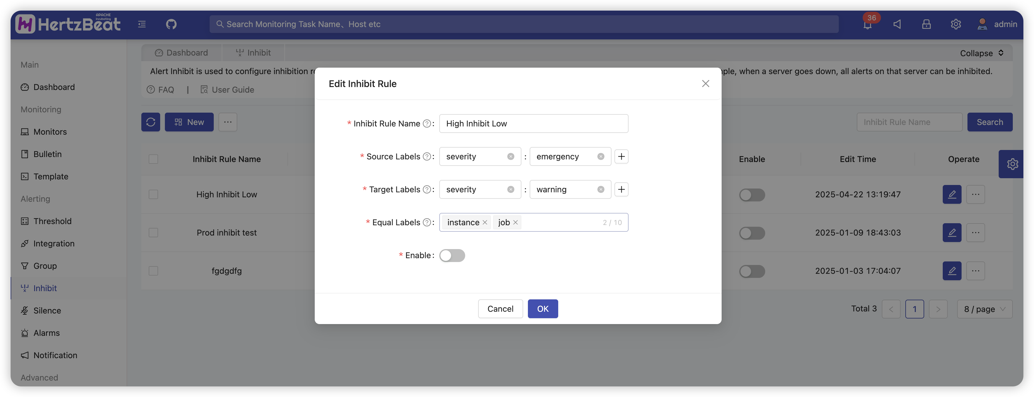 告警抑制:用于配置告警之间的抑制关系,比如同一实例下高级别告警抑制低级别告警