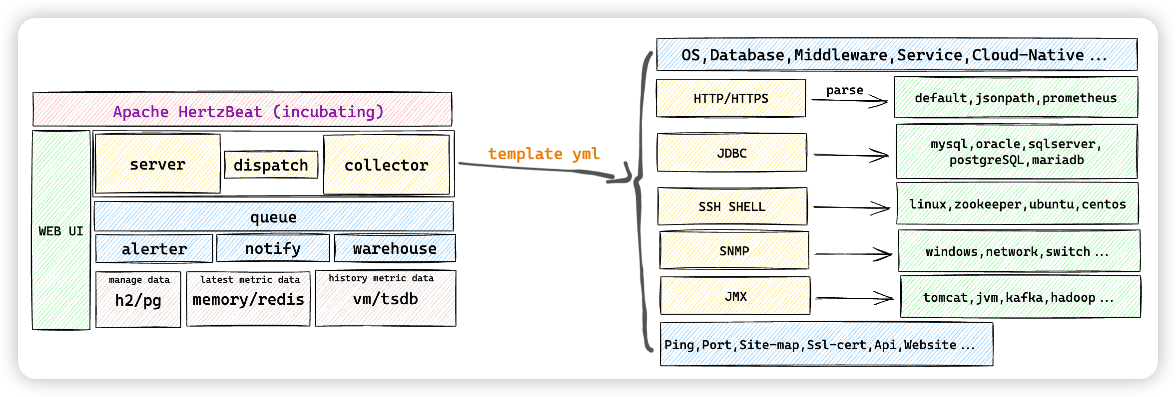 监控模板:HertzBeat 将 Http, Jmx, Ssh, Snmp, Jdbc, Prometheus 等协议规范可配置化,只需在浏览器配置监控模板 YML 就能使用这些协议去自定义采集想要的指标
