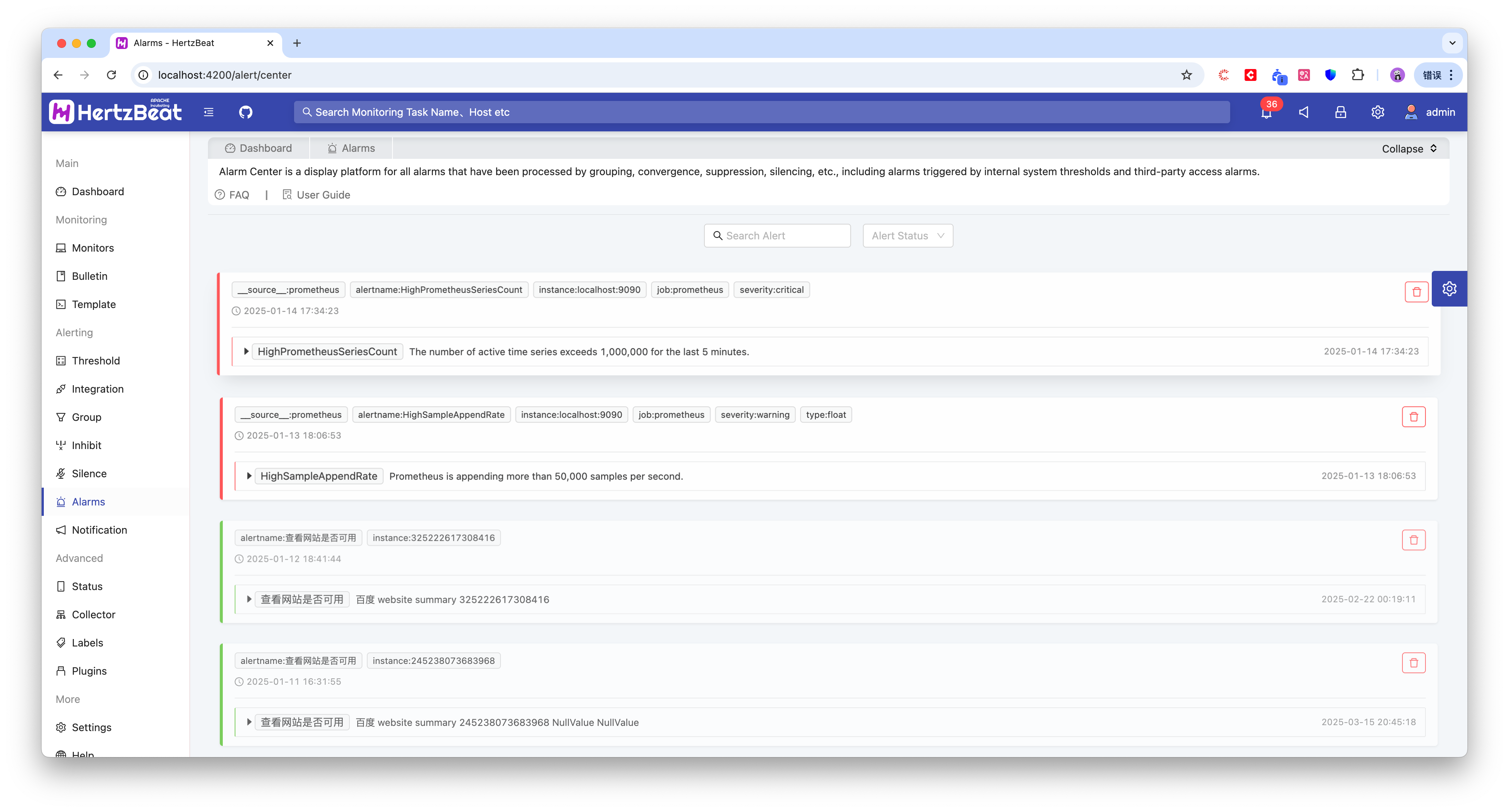 告警中心:已触发告警消息的管理展示页面,使用户有直观的展示当前告警情况