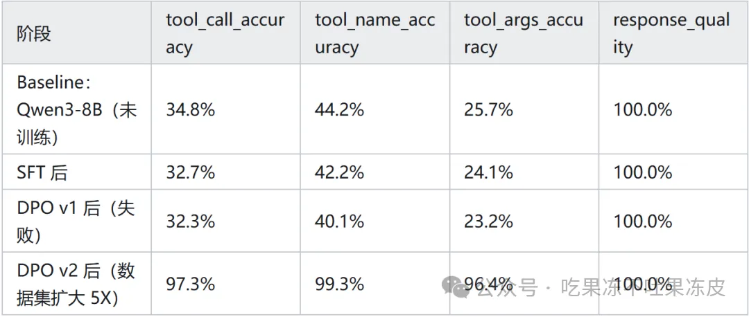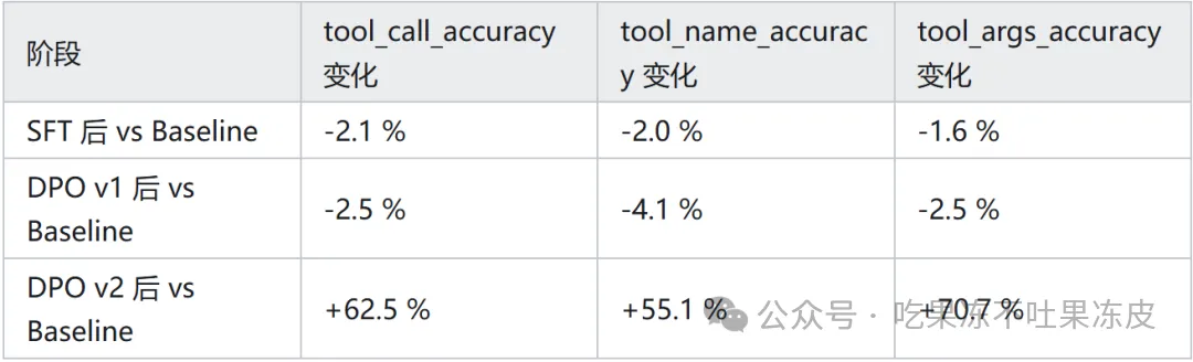 - 在扩大 DPO 数据覆盖(从 v1 到 v2,数据集扩大到原来的 5X)后,工具调用相关指标从约 30% 级别提升到约 97%~99% 级别;