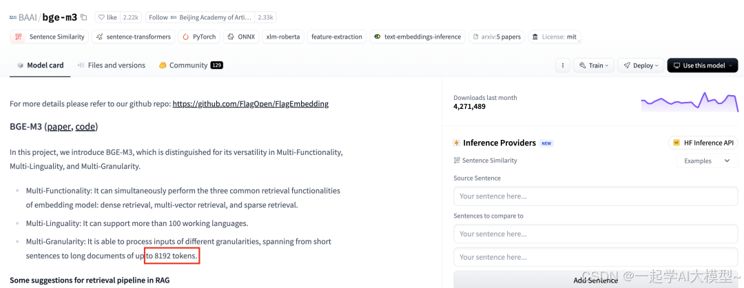 一般我们通过嵌入模型来生成嵌入向量,而嵌入向量往往也有上下文窗口大小的限制。以常见的 bge-m3 为例,我们可以在介绍文档中看到最大 token 数的限制。