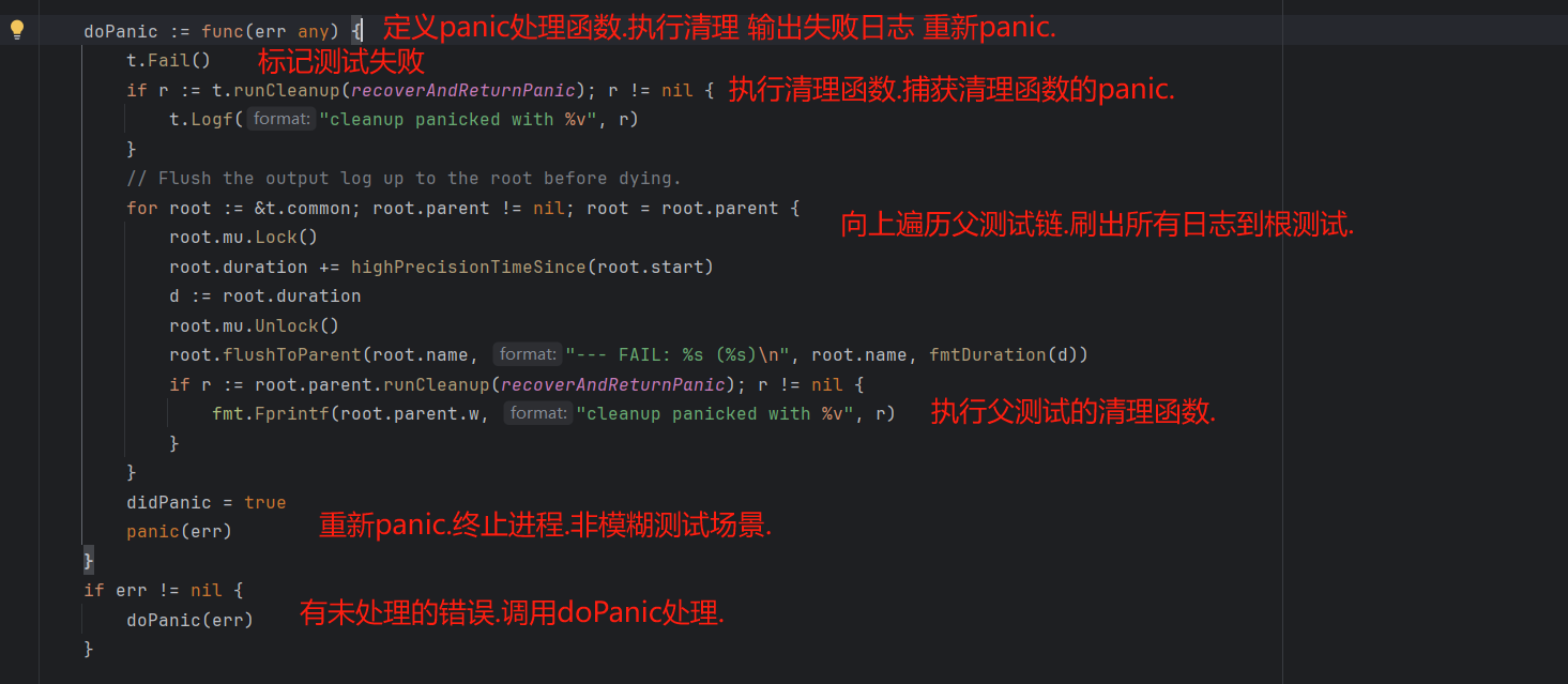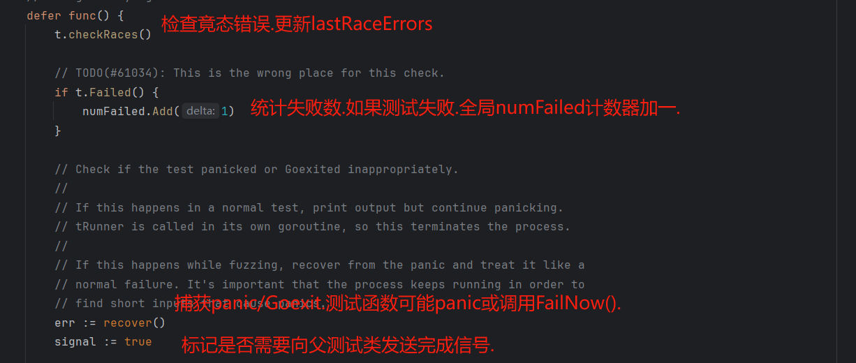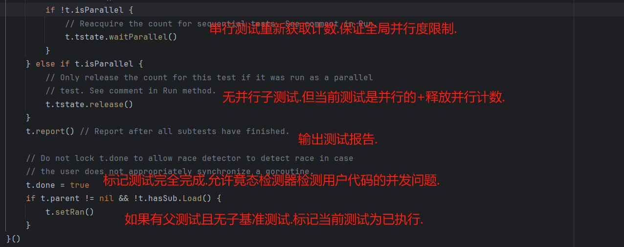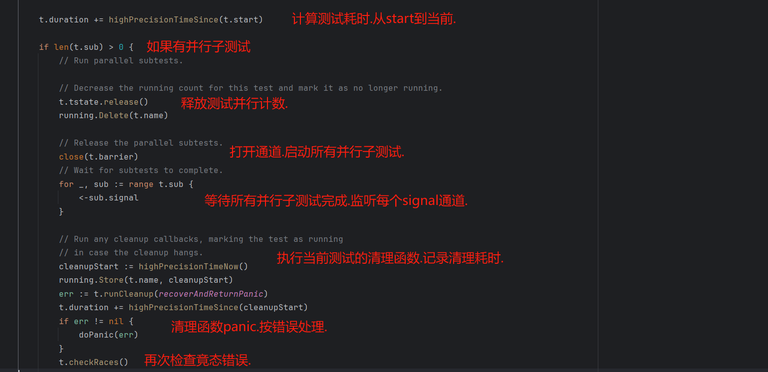 所有测试执行后的收尾操作都在这里.包括.统计失败数.处理panic/Goexit 执行清理函数 协调并行子测试 完成发送信号.