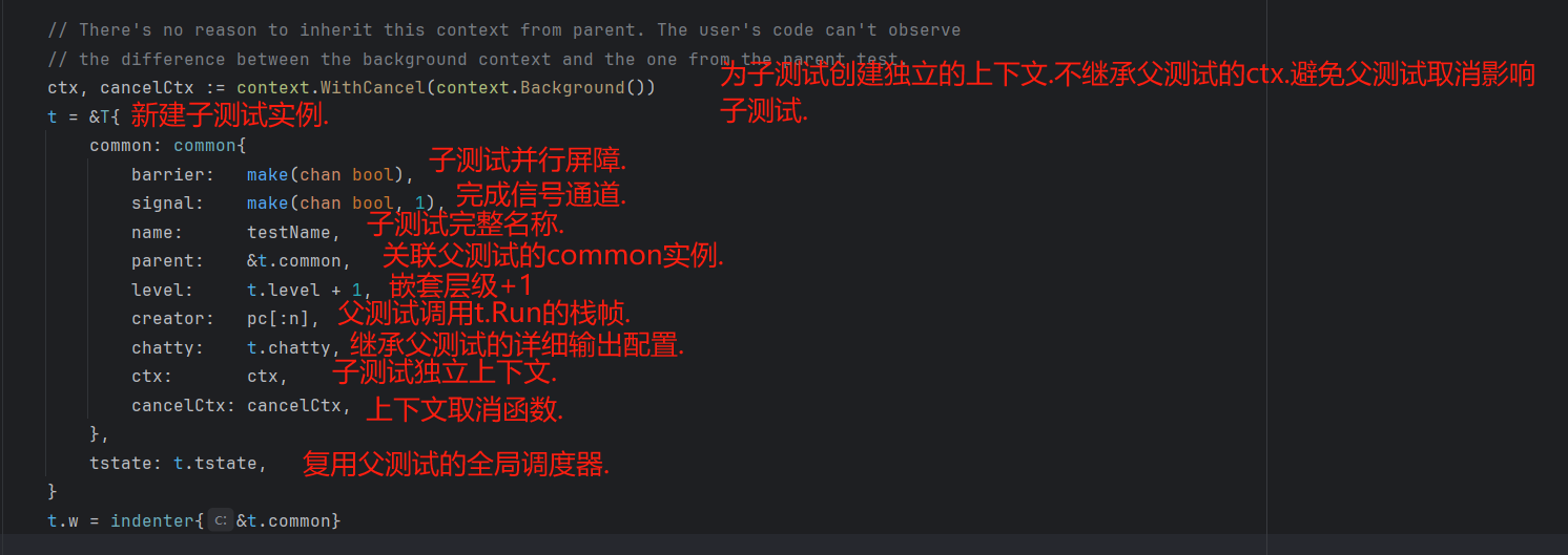 creator:子测试创建栈.当有子测试时.存储父测试调用t.run时的栈追踪信息.用于调