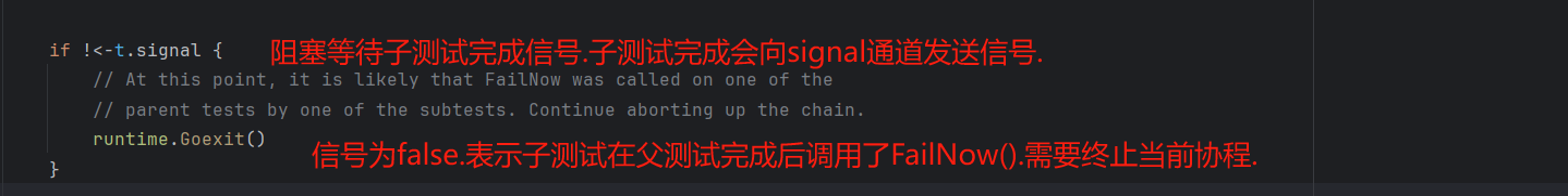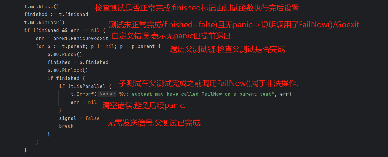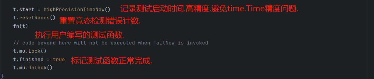 如果在测试函数中调用t.FailNow()(底层是runtime.Goexit).则fn(t)之后的代码不会在执行.finished仍标记位false.