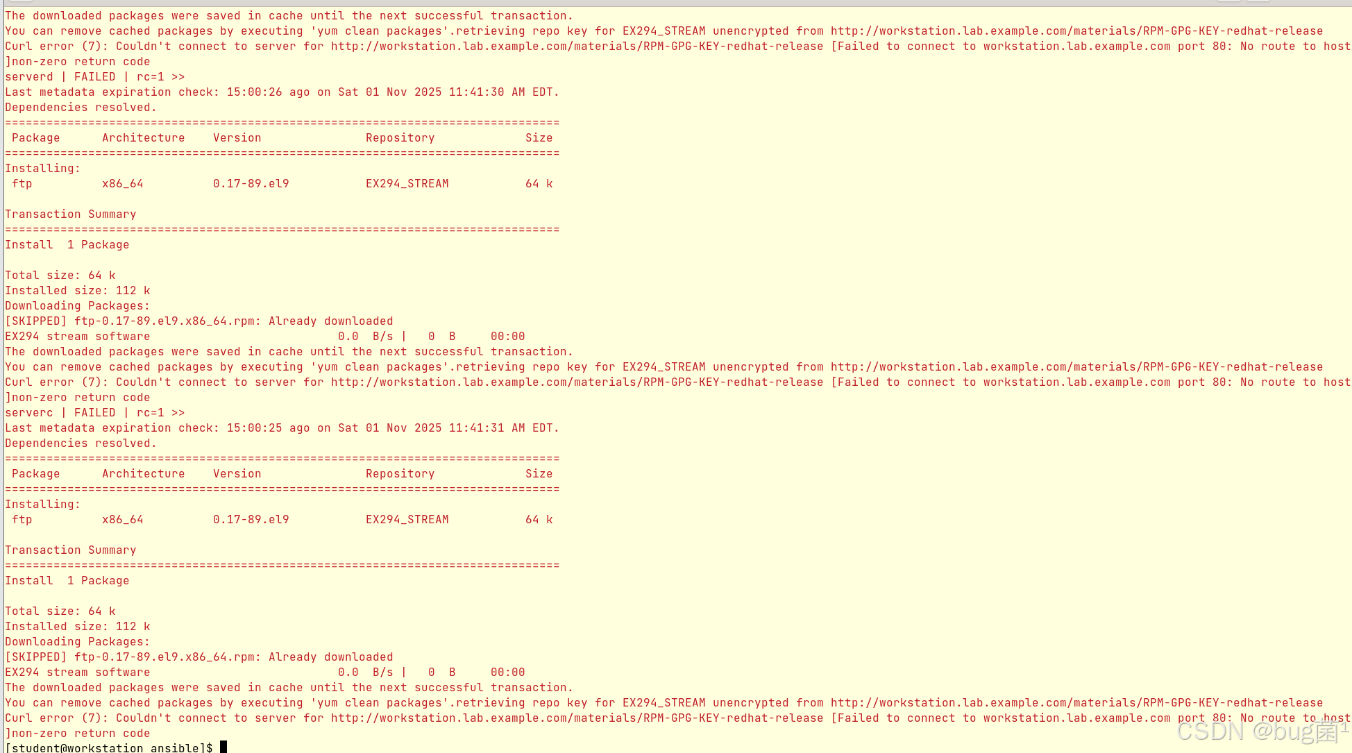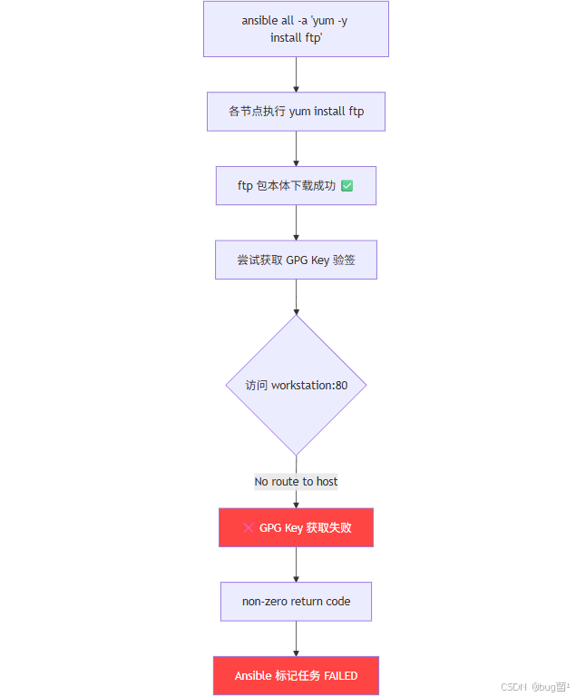🎯 问题核心: 被控节点安装 ftp 包后,yum/dnf 尝试从 workstation.lab.example.com:80 拉取 GPG Key 做签名验证,但 workstation 的 HTTP 服务不可达,导致验证失败,Ansible 判定任务失败。