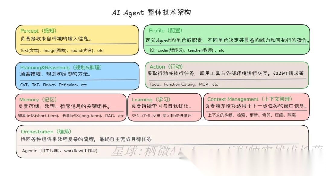 通过之前对AI Agent概念框架的了解,再来看构建Al Agent的技术架构,对其所需要的核心组件就会有更清晰的认知。我们梳理了当前许多研究人员及机构对构建智能体技术架构的研究成果,结合实践经验,提炼出构建AI Agent的整体技术架构,包括八个模块:Profile(配置)、Percept(感知)、Planning & Reasoning(规划&推理)、Action(行动)、Memory(记忆)、Learning(学习)、Context Management(上下文管理) 和 Orchestration(编排)。如下图所示: